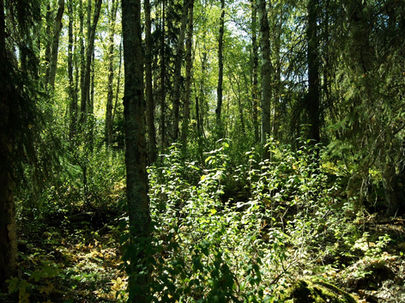Primarily mixed forest of Birch and Aspen, with scattered Douglas Fir and Spruce trees.